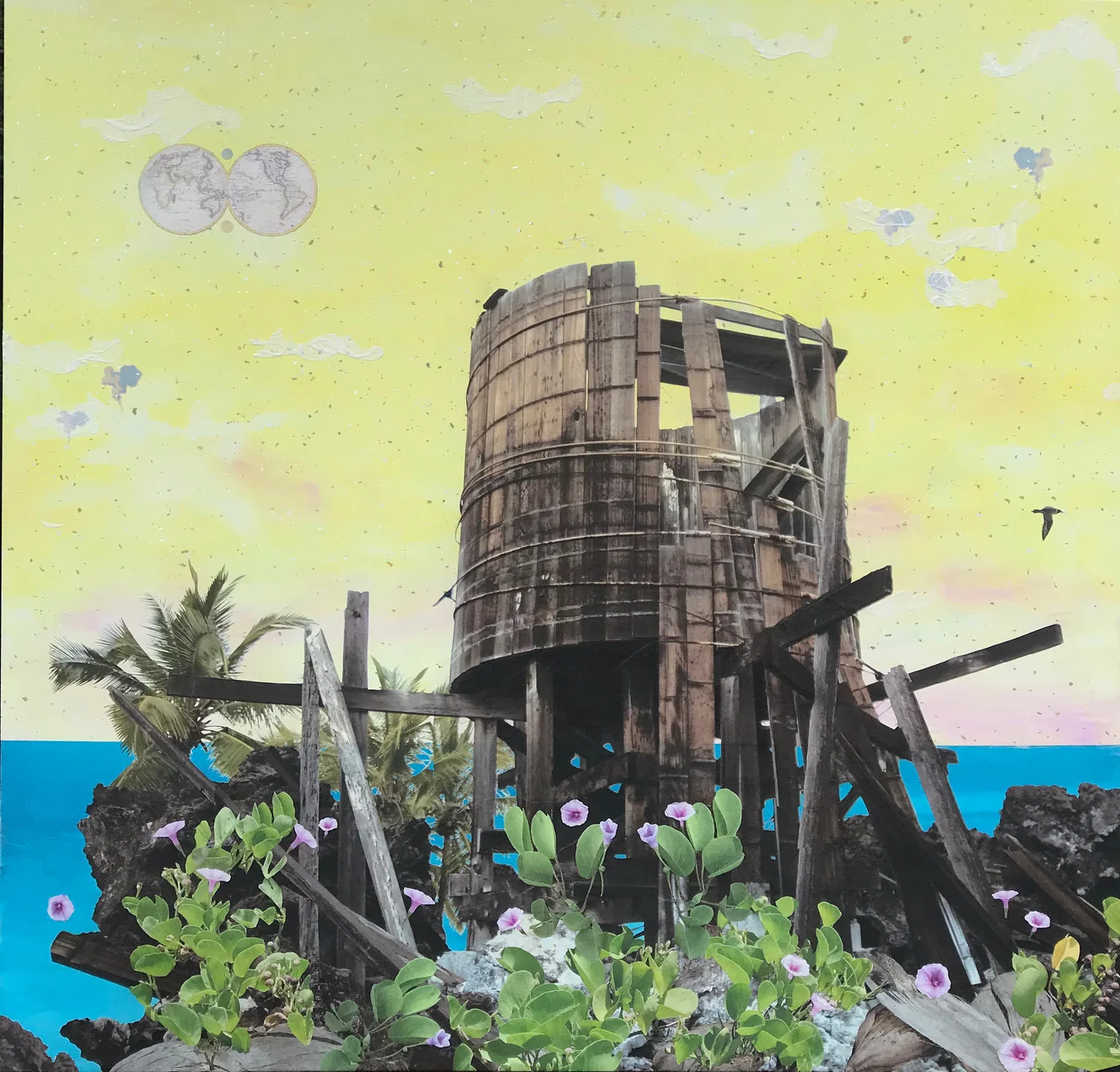 Containment Landscape series, Kalaoa Tank, 24" x 24" Hand cut kozo prints, goauche, layered papers and fibers on canvas