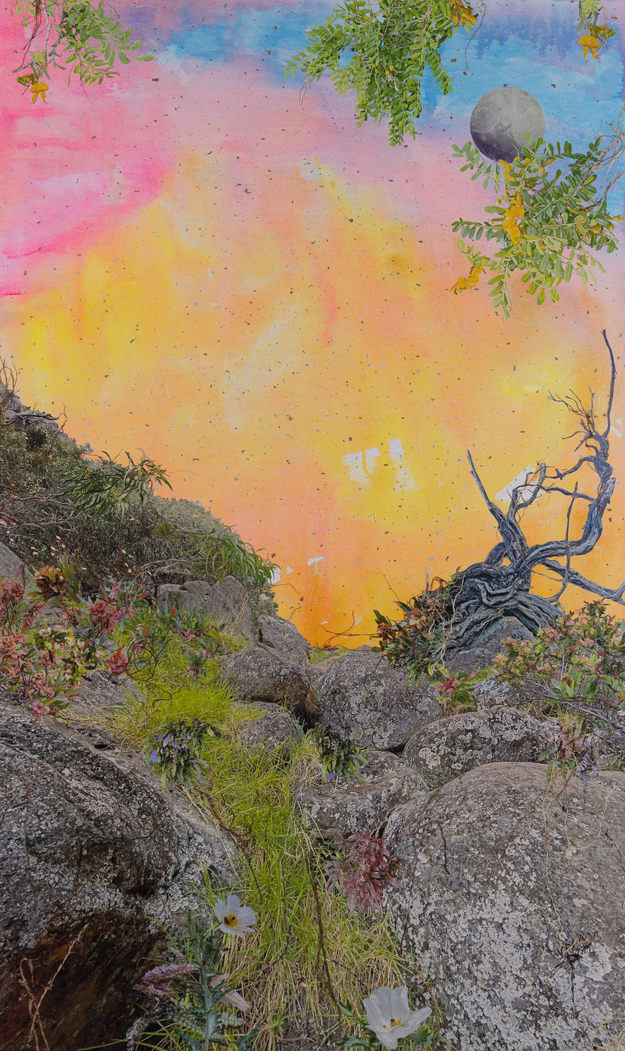 Containment Landscape Series, Koai'a Tree Sanctuary, 48" x 48" Hand cut kozo prints, goauche, layered papers and fibers on canvas