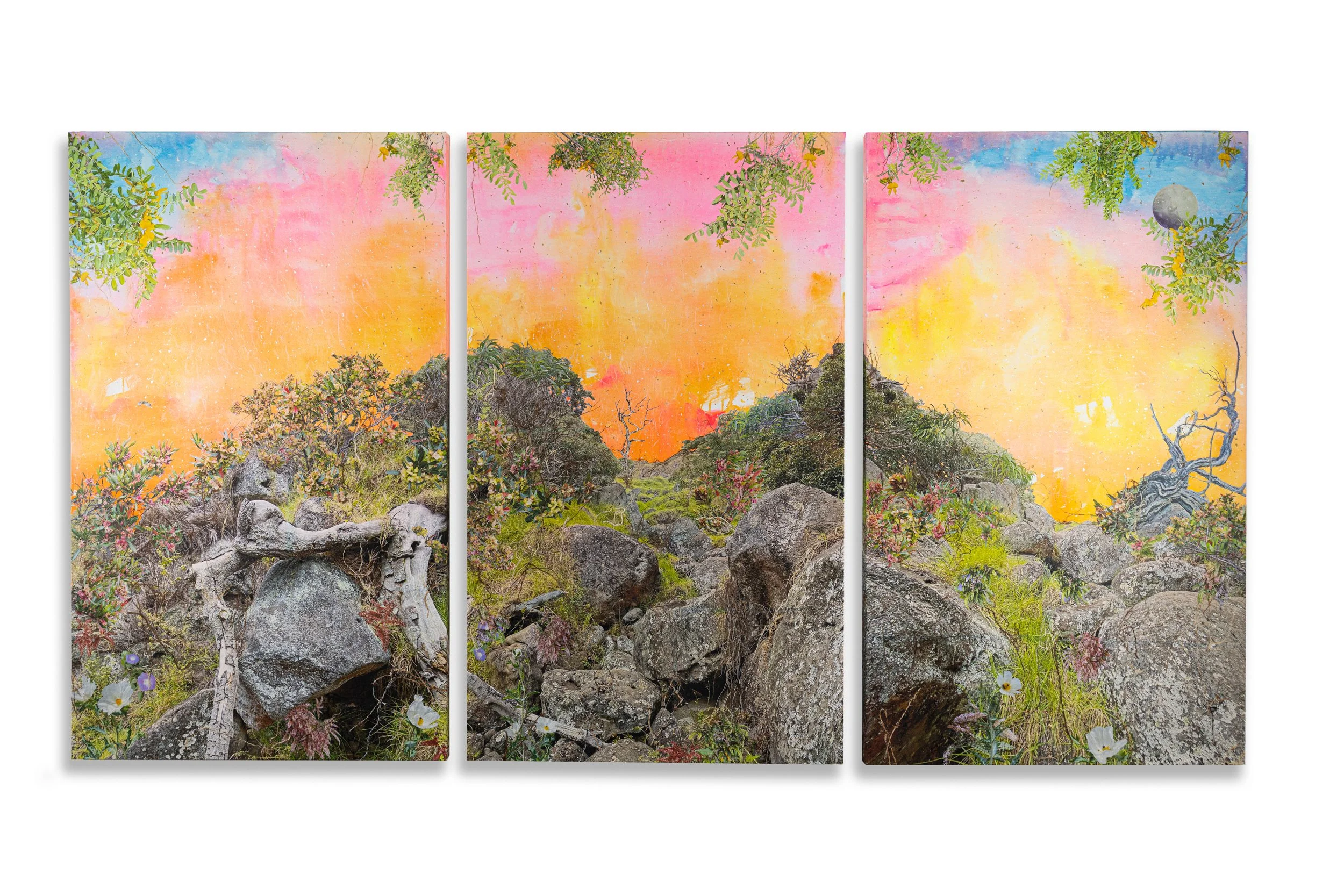 Aggregate and Renewal, Tryptich, 36" x 60" each Hand cut kozo prints, goauche, layered papers and fibers on canvas