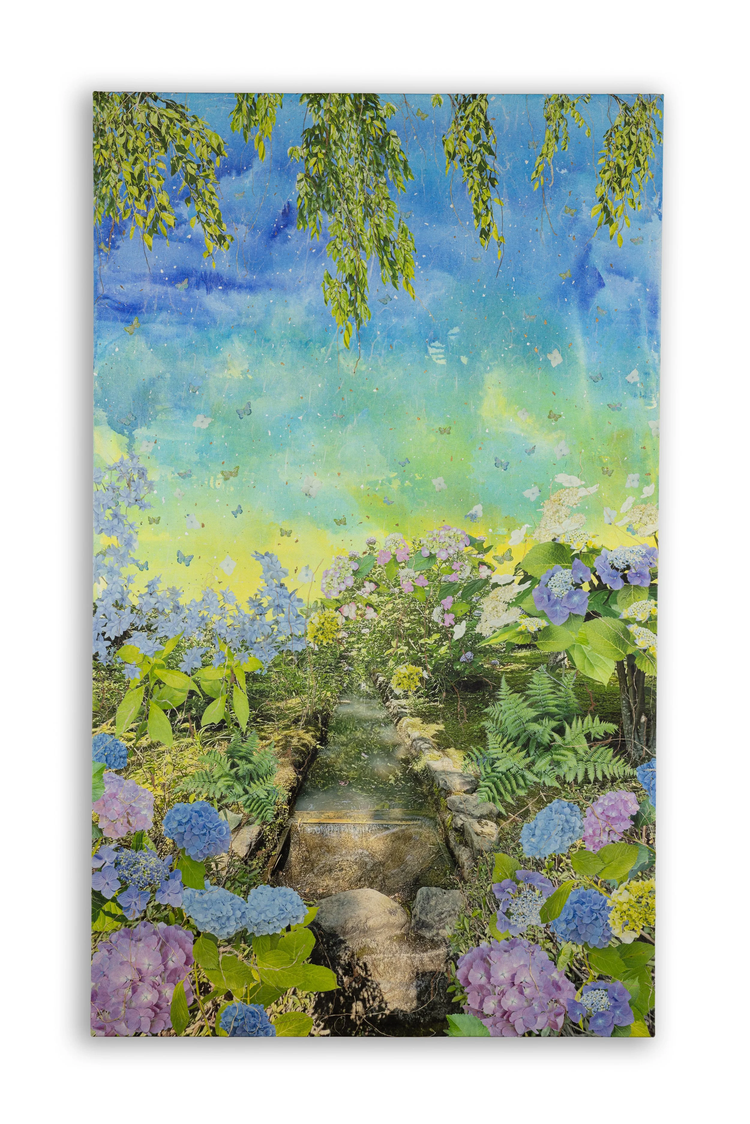 All the tears I have yet to cry, Tenryu-ji waterway with hydrangeas, 36" x 60" Hand cut kozo prints, goauche, layered papers and fibers on canvas