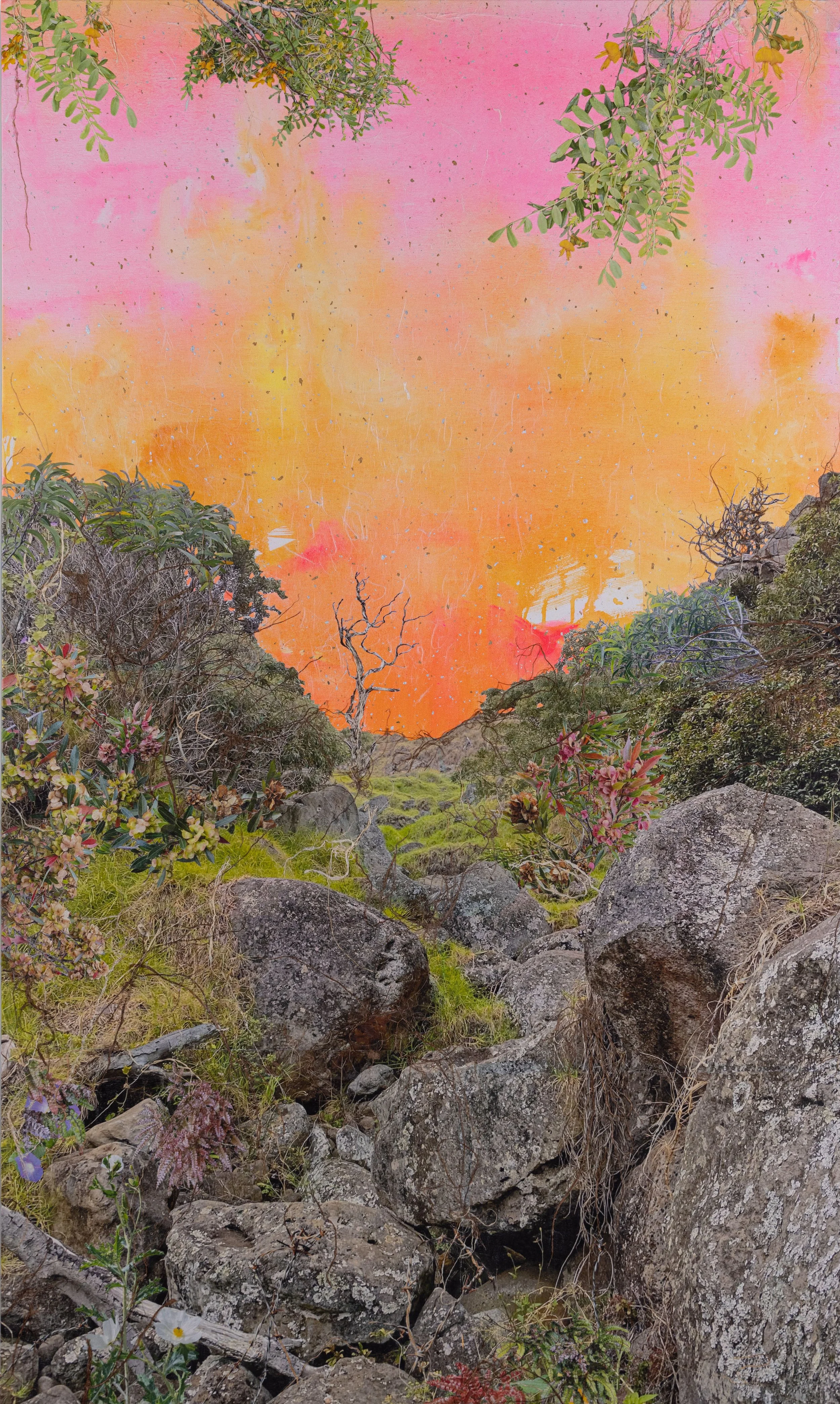All the tears I have yet to cry, Kohala Ditch, 23" x 37", Hand cut kozo prints, goauche, layered papers and fibers on canvas