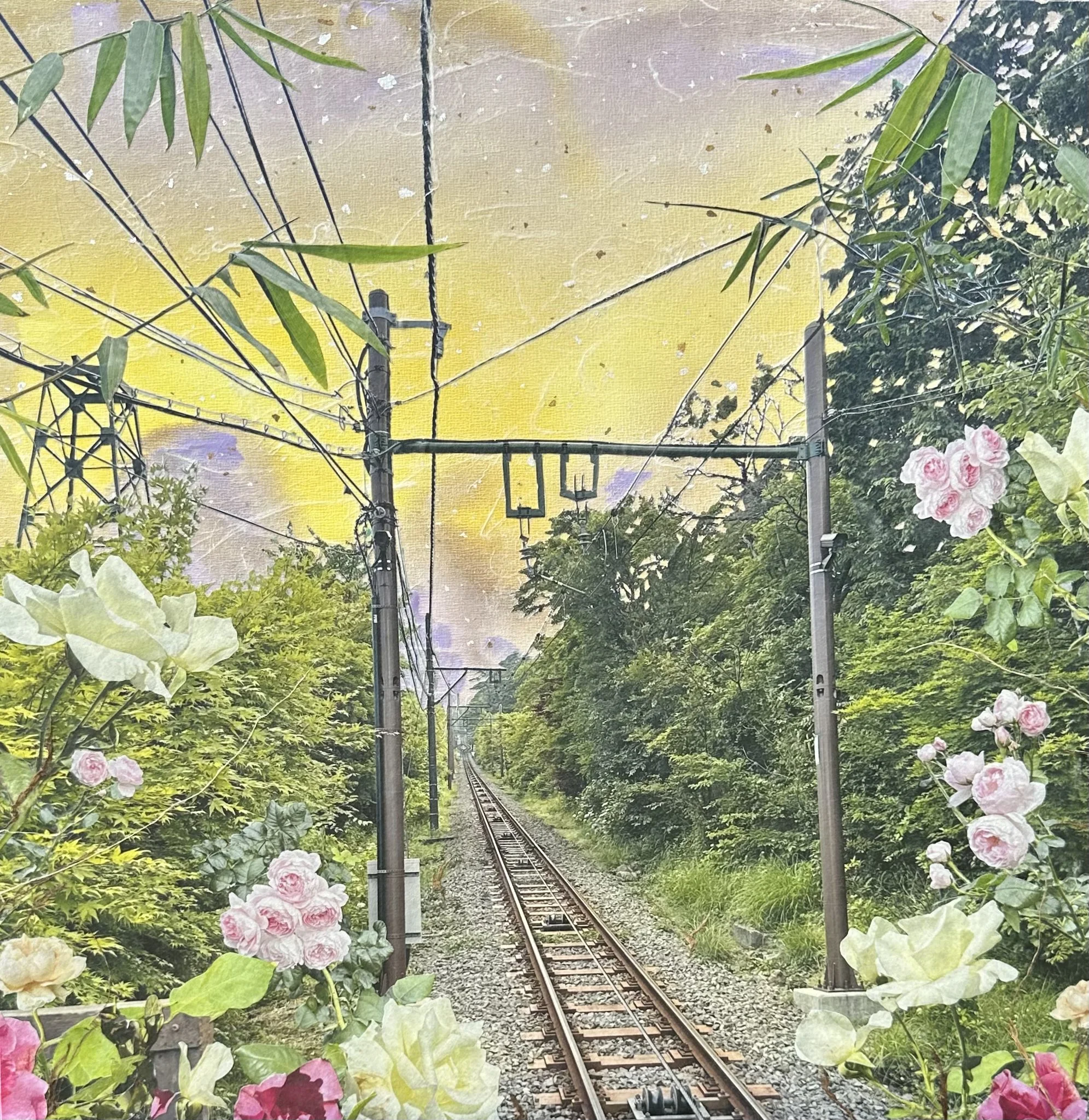 Somewhere near and far, Hakone Cabel car, 18" x 18" Hand cut kozo prints, goauche, layered papers and fibers on panel