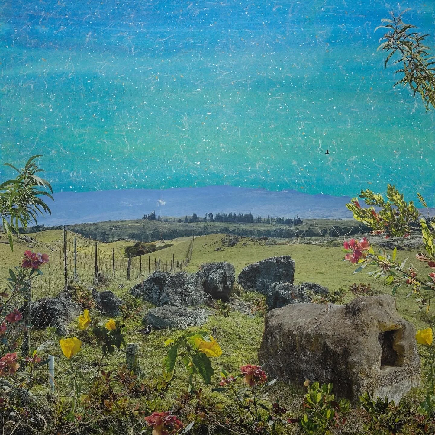 Somewhere near and far, Waiki'i Ranch, 48" x 48" Hand cut kozo prints, goauche, layered papers and fibers on canvas