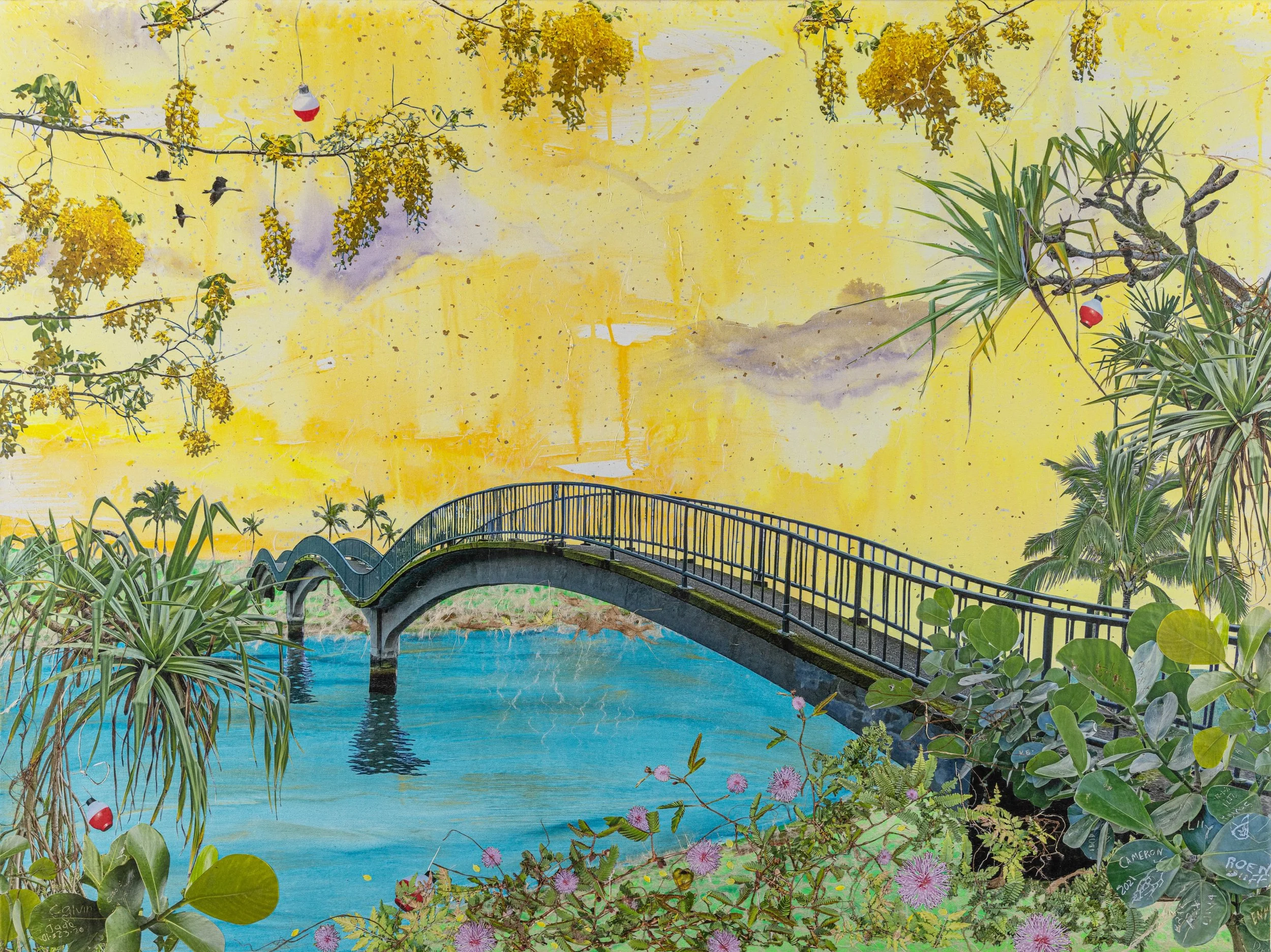 Crossings, Waikamalo Bridge, 30" x 22" Hand cut kozo prints, goauche, layered papers and fibers on canvas